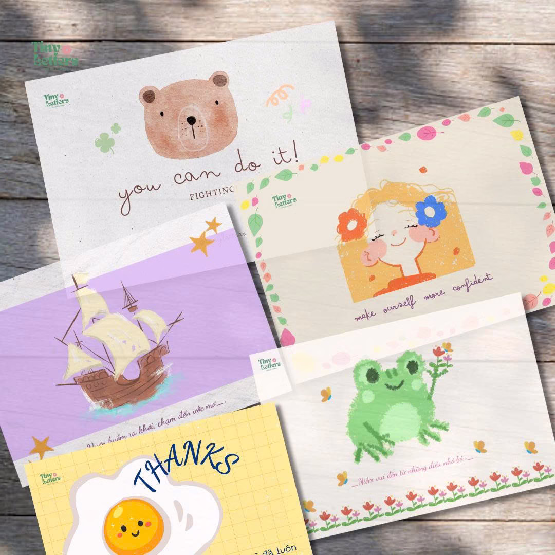 Thiết kế: Các mẫu thiệp được in hình vẽ ngộ nghĩnh với các hình ảnh đáng yêu như gấu, thuyền, ếch, trứng ốp la, với các thông điệp truyền cảm hứng như “You can do it!”, “Thanks”, “Make yourself more confident”, và “Fighting”.